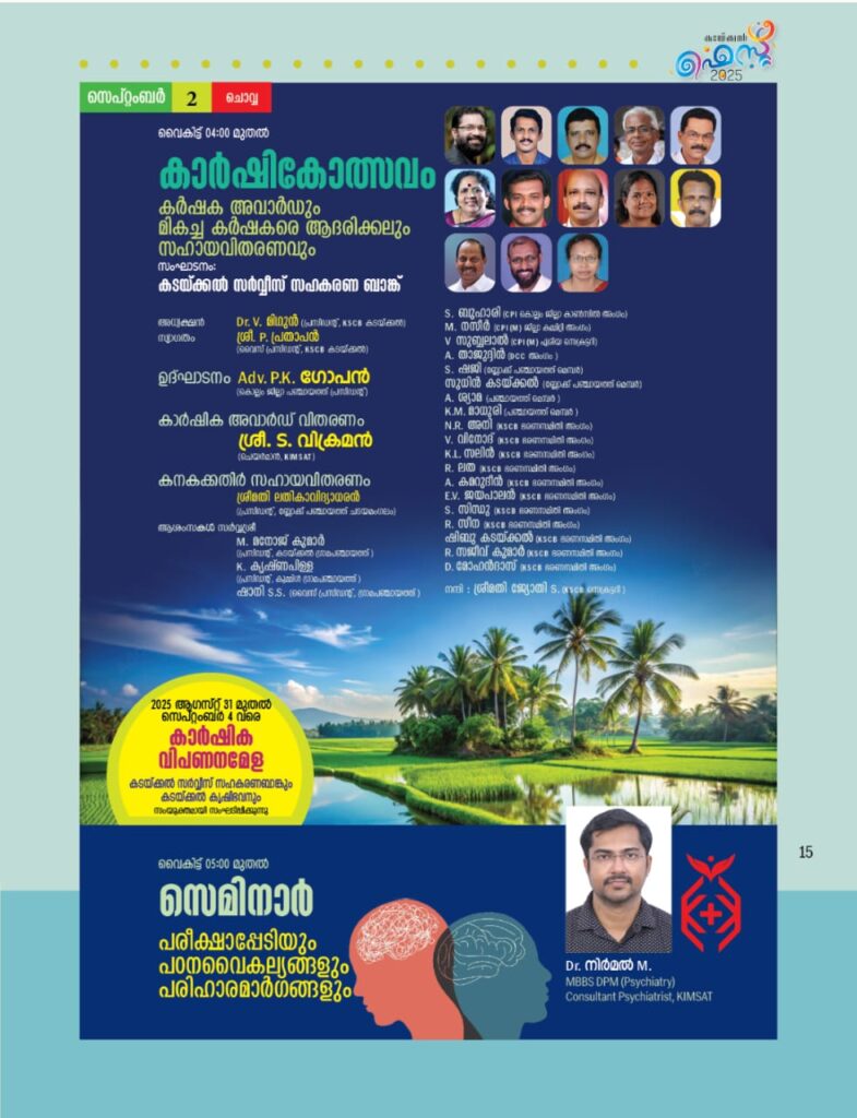 കടയ്ക്കൽ ഫെസ്റ്റ് വേദിയിൽ കിംസാറ്റിലെ പ്രശസ്ത സൈക്കാട്രി വിദഗ്ധൻ ഡോ നിർമ്മൽ നയിക്കുന്ന ബോധവൽക്കരണ ക്ലാസ് വിഷയം; കുട്ടികളിലെ പഠന വൈകല്യങ്ങളും, പരീക്ഷാ പേടിയും പരിഹാര മാർഗ്ഗങ്ങളും.ഇന്ന് (02-09-2025) വൈകുന്നേരം 5 മണിക്ക് കടയ്ക്കൽ ഫെസ്റ്റ് വേദിയിലാണ് ബോധവൽക്കരണ ക്ലാസ്സ് സംഘടിപ്പിച്ചിരിക്കുന്നത്.