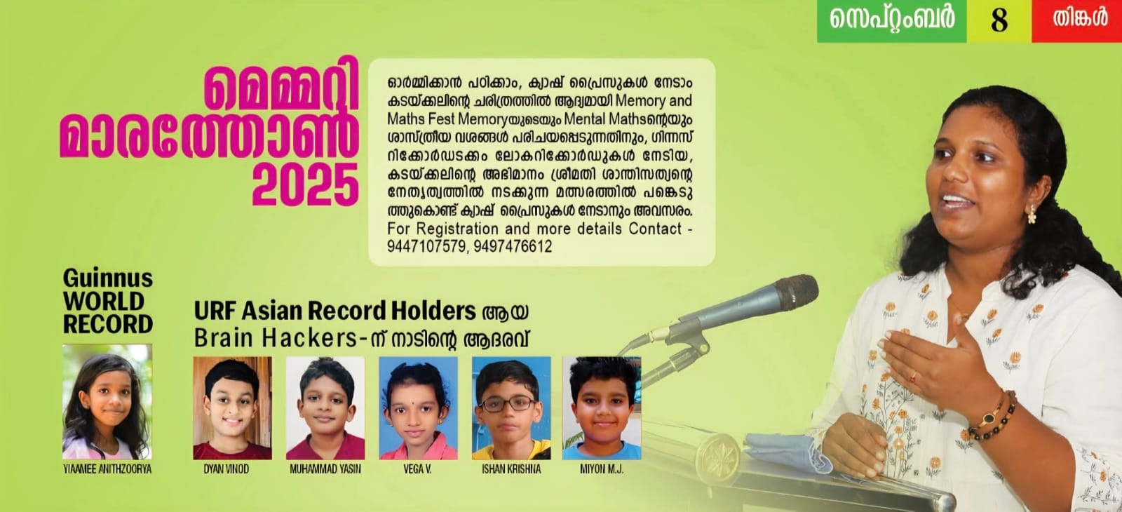 കടയ്ക്കൽ ഫെസ്റ്റിന്റെ ഭാഗമായി സംഘടിപ്പിക്കുന്ന “മെമ്മറി മാരത്തോൺ 2025” മത്സരം നാളെ’ തിങ്കളാഴ്ച വൈകുന്നേരം 4 മണിക്ക് കടയ്ക്കൽ പാർക്കിൽ നടക്കുന്നു.ഗിന്നസ് വേൾസ് റെക്കോർഡ് ജേതാവായ ശാന്തി സത്യൻ നയിക്കുന്നു